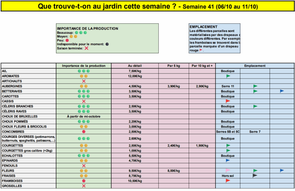 Sur cette page, vous pourrez savoir chaque semaine ce qui est disponible au jardin et leurs tarifs. Le contenu sera mis à jour régulièrement en fonction de l’avancement des cultures.