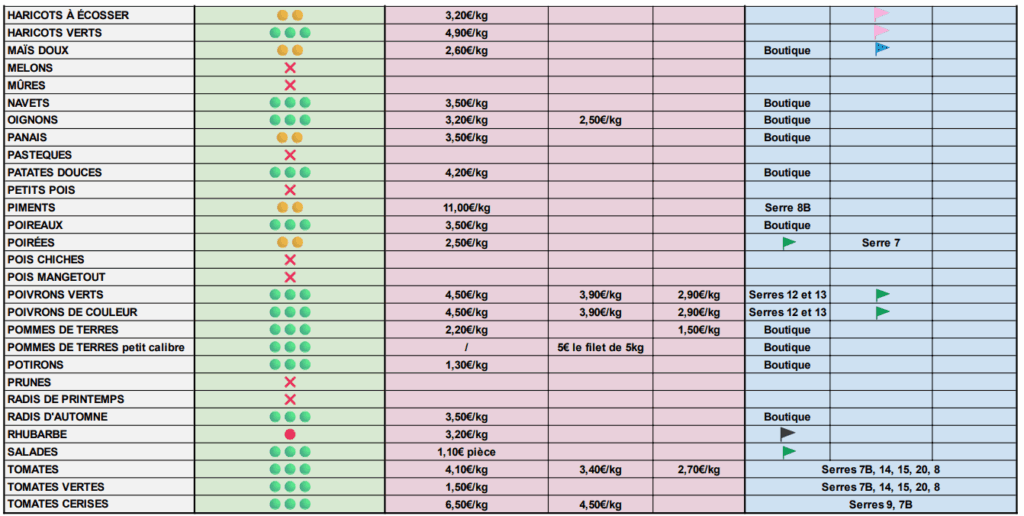 Un peu plus bas sur ce site, vous trouverez également un plan interactif de la cueillette, très pratique pour repérer où se trouvent les différents fruits et légumes. En cliquant sur une zone (comme une zone de serres ou une parcelle), vous voyez s’afficher les produits disponibles en ce moment (en vert), ainsi que ceux à venir avec une estimation de leur disponibilité. Sur le terrain, chaque grande parcelle est repérée par un drapeau de couleur, et ses limites sont matérialisées par des jalons assortis à cette couleur. Les sous-parcelles sont quant à elles identifiées par des numéros apposés sur les jalons.